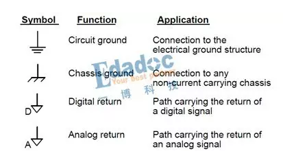 回到EMC培訓(xùn),Mark的觀點(diǎn)其實(shí)很清楚了,那就是地在PCB里是不存在的,它只是0v參考的符號象征。除非我們的設(shè)計(jì)或應(yīng)用在操作上需要區(qū)分?jǐn)?shù)字和模擬電路,且需要將兩者彼此分割,或者需要從0v參考地區(qū)分不同的功能區(qū)域如機(jī)殼和ESD地,而且就算在同一系統(tǒng)里使用不同的地,在系統(tǒng)的某個(gè)地方也需要將這幾種不同的地連接起來,并且需要EMC工程師來保障相關(guān)的連接是否可行。除此之外其他的設(shè)計(jì)都建議大家使用一個(gè)地的符號來表示0v參考。下圖是幾個(gè)常見地的表示符號及功能應(yīng)用解釋,注意數(shù)字和模擬地用的是回流來形容而不是地。