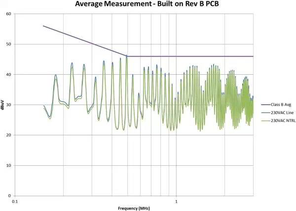 這是一條令人關(guān)注的曲線,因為它反映出了幾個問題:明顯超出了規(guī)范要求的較低頻率輻射、共模問題通常很明顯的1MHz至2MHz組件,以及較高頻率組件的衰減正弦(x)/x分布。