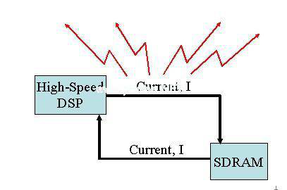 圖7:利用端接將傳輸線效應(yīng)減到最小。 設(shè)計師可能會質(zhì)疑,既然芯片內(nèi)部已經(jīng)整合了電阻,在外部端接負載電阻是否還有其重要性。實際上,除了控制傳輸線效應(yīng)外,外部電阻還可以實現(xiàn)訊號完整性的精密調(diào)整。DSP無法與電路板阻抗完全匹配,因此端接負載可以減少源電流,以及上升和下降時間。 與外部端接負載電阻一樣,外部的上拉和下拉電阻也非常重要。對于無連接的接腳來說,雖然內(nèi)部的上拉和下拉電阻是足夠的,但高速開關(guān)噪音能夠傳過來,并會誤觸發(fā)連接端上的內(nèi)部邏輯??刂?/span>EMI 能夠輻射到系統(tǒng)外的輻射被認為是EMI,這可能使設(shè)計無法通過FCC認證。有兩種可能的輻射:一種是發(fā)射源是一條直線型的訊號印刷線,或電纜的共模輻射,另一種是其訊號和回路構(gòu)成一個大電流回路的差分模式輻射。共模輻射隨著頻率的升高而降低,而差分模式輻射則隨著頻率的升高而增強,直到其飽和點。這兩種模式的輻射如圖8和9所示。 如何處理EMI取決于輻射源。對于共模輻射,當(dāng)EMI來自外部電纜時(如圖8所示),可在電纜上加一個扼流圈。如果導(dǎo)致EMI的是內(nèi)部傳輸線,則通常用端接負載方式,不過在訊號印刷線間加入一條地線也有助于減少輻射。另一種可能方案是將訊號的印刷線長度減短至小于訊號波長(或訊號頻率的倒數(shù))的1/20。例如,為了避免傳輸輻射,500MHz的印刷線應(yīng)該短于1.18英吋。