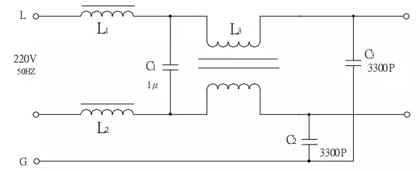 圖中L1、L2、C1構(gòu)成常模濾波器,L3、C2、C3構(gòu)成共模濾波器。